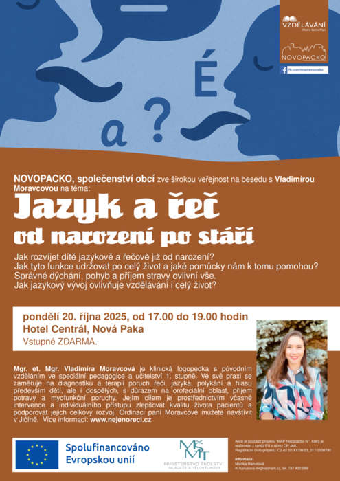 Seminář pro veřejnost proběhl s názvem "Jazyk a řeč od narození po stáří" ve velkém sále hotelu Centrál v Nové Pace dne 20.10.2025 od 17:00 do 19:00 hodin. Semináře se zúčastnilo 12 osob z řad veřejnosti. Lektorka Mgr. et Mgr. Vladimíra Moravcová seznámila přítomné s tím, jak rozvíjet děti jazykově a řečově od narození, jak tyto funkce udržovat po celý život, jaké pomůcky k tomu mohou pomoci, jak správně dýchat, jak řeč ovlivňuje pohyb a příjem potravy a jak jazykový vývoj ovlivní vzdělávání i celý život jedince.